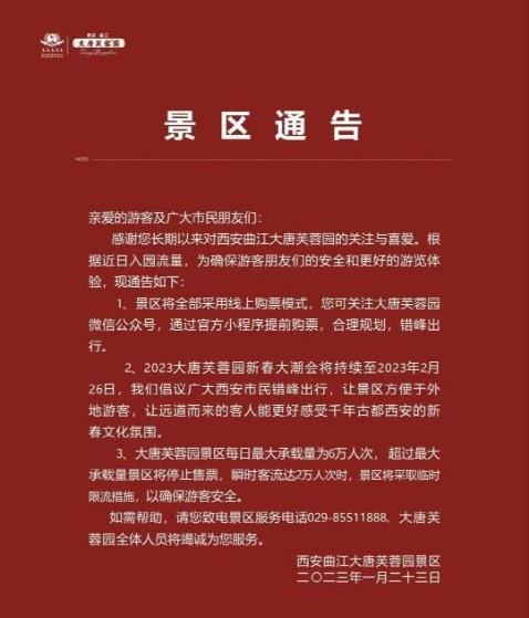 1月23日起,西安城墙景区、大唐不夜城、大唐芙蓉园等多个景点采取临时限流措施或演出时间调整措施。