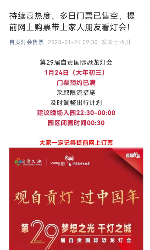 “中华彩灯大世界”官微连续三日(1月22-24日)发布门票预约已满公告,第29届自贡国际恐龙灯会预约已满,园方将采取限流措施,请游客及时调整出行计划,建议晚场入园观灯22:30~00:00,闭园时间为00:30。