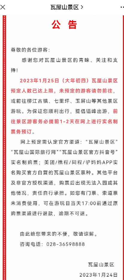 1月24日,瓦屋山景区发布公告称:2023年1月25日(大年初三)瓦屋山景区预定人数已达上限,未预定的游客请勿前往,或前往柳江古镇、七里坪、玉屏山等其他景区游玩。为保证顺利出行,提倡错峰出游,前往景区游客务必提前1-2天在网上进行实名制票务预订。这已是瓦屋山景区连续三日发布类似公告。