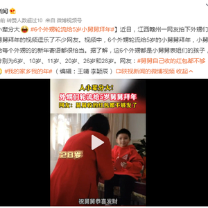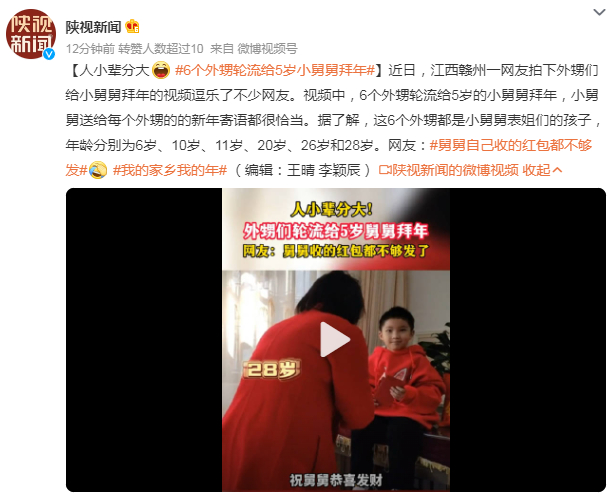 近日,江西赣州一网友拍下外甥们给小舅舅拜年的视频逗乐了不少网友。视频中,6个外甥轮流给5岁的小舅舅拜年,小舅舅送给每个外甥的新年寄语都很恰当。据了解,这6个外甥都是小舅舅表姐们的孩子,年龄分别为6岁、10岁、11岁、20岁、26岁和28岁。网友:舅舅自己收的红包都不够发。