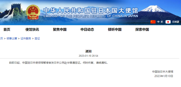 同日,针对日本此前的相关措施,中国驻日本大使馆发布通知:自即日起,中国驻日本使领馆暂停审发日本公民赴华普通签证。何时恢复,请候通知。