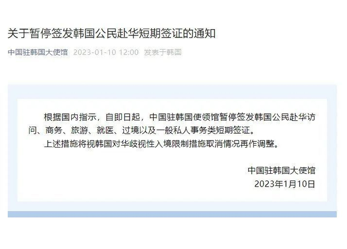 10日,中国驻韩国大使馆发布关于暂停签发韩国公民赴华短期签证的通知:根据国内指示,自即日起,中国驻韩国使领馆暂停签发韩国公民赴华访问、商务、旅游、就医、过境以及一般私人事务类短期签证。上述措施将视韩国对华歧视性入境限制措施取消情况再作调整。