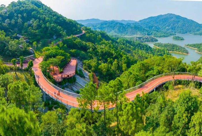 往步道深处走,青山环抱绿水,木质的围栏呈现的是典型的岭南风格。公园一侧是黄绿背水库,清澈的水面微风吹过,泛起阵阵涟漪,令人心旷神怡。