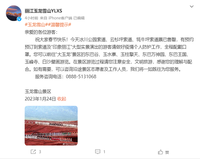 1月23日,@大理文旅发布厅 转发通告,宾川鸡足山景区限流预警!