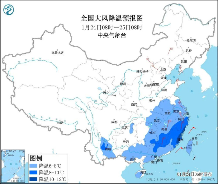 受寒潮影响,预计,1月24日8时至25日8时,黄淮南部、江汉东部、江淮、江南大部、华南、云南东部等地气温将下降6~8℃,其中,浙江东部和南部、福建大部、江西中南部、广东北部等地部分地区气温下降8℃以上,局地降温超10℃。上述地区先后有4~6级风,阵风7~8级。我国近海大部海域有6~8级风,阵风9~10级。过程最低气温出现在25日早上,最低气温0℃线将位于云南东部、贵州南部至华南北部一线。