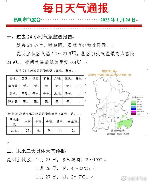 昭通、曲靖、昆明东部、文山北部和东部、红河东北部阴局部有雨夹雪或小雪,红河南部、普洱东南部阴局部有小雨,昆明西部、楚雄、玉溪阴,西双版纳多云,其它地区晴间多云。