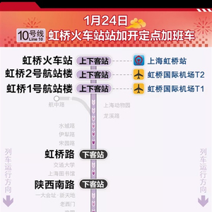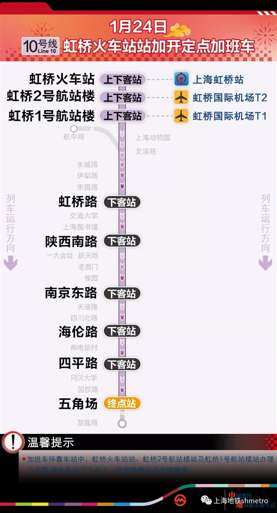 东方网记者刘辉1月24日报道:记者今天从申通地铁集团获悉,因今日虹桥火车站返程大客流密集到达,10号线虹桥火车站末班车后实施加开定点加班车至1月24日24时。加开列车始发站虹桥火车站,终点站五角场,中途停靠虹桥2号航站楼、虹桥1号航站楼、虹桥路、陕西南路、南京东路、海伦路、四平路。其中除始发站虹桥火车站,虹桥2号航站楼、虹桥1号航站楼可以上下客,其余各停靠站都只能下车。