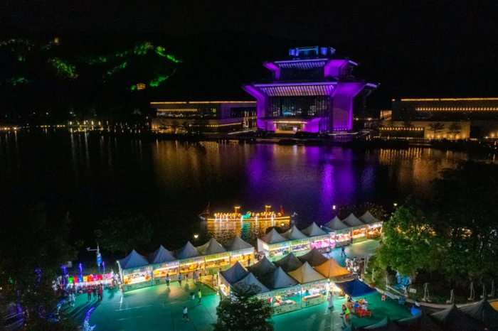 灯光耀眼夺目、水幕喷泉震撼心灵、锣鼓昂扬雄壮、粤曲新唱韵味十足、民乐弹奏荡气回肠、水上舞蹈婀娜曼妙、水廊花船喜气洋洋……这就是充满岭南水乡韵味的《这,就是紫南》。表演巧妙利用亲水平台和水廊碧道,融水、陆、空为一体,呈现一场妙曼多姿的大型水舞声光歌舞晚会。