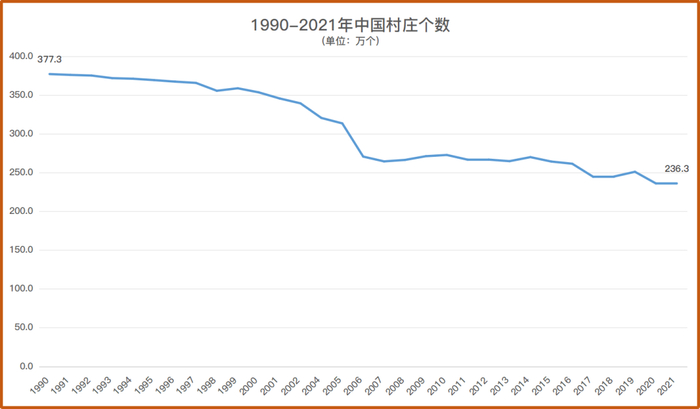 1990年,全国村庄数量377.3万个,到了2021年剩下263.3万个,31年时间减少了114万个。