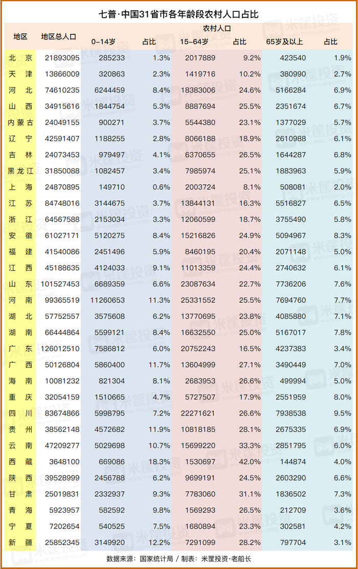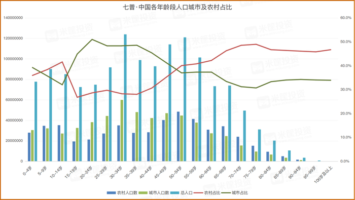 如果我们把各个年龄段的人口,按照城市和农村占比拆分,更能说明问题。