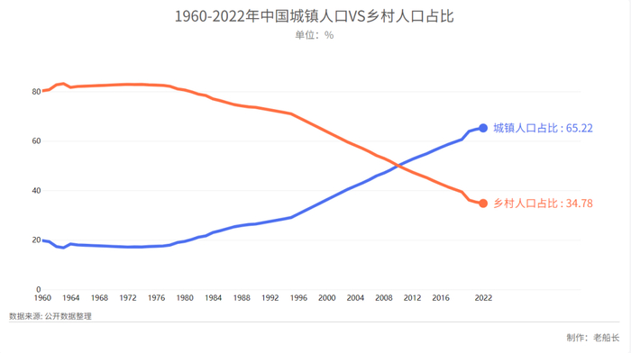 1960年时,中国80%的人都在农村。到2021年,城镇居民已经超过了65%。