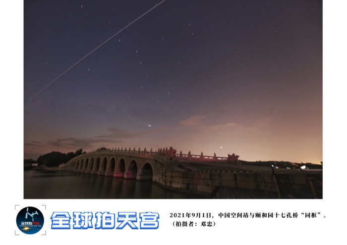 ↑中国空间站与颐和园十七孔桥“同框”。颐和园十七孔桥“金光穿洞”奇观每年都会吸引众多游客前往“追光”。