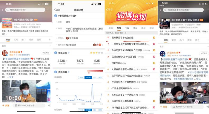 其中多个短视频形成热点:《回家过年》短视频被新浪微博热搜置顶,同时居快手热搜榜第二位;“这辆出租车载着多少忙碌的人”也冲上热搜榜,《【春天 我想对你说】你的平安团圆 有我在守护》短视频在微博视频榜位居前列。