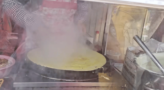 热腾腾的粘火烧、粘豆包,谁看了都得停下脚步;巧克力味和酸奶味儿的炸油条让人不做选择干脆各来一份;烤冷面、豆腐脑也可以坐下吸溜一碗;夹辣条的煎饼果子可以当中午饭边逛边吃,再配一根裹满孜然和辣椒面的大烤肠,用东北大集最常见的标语,那就是“嘎嘎香”。