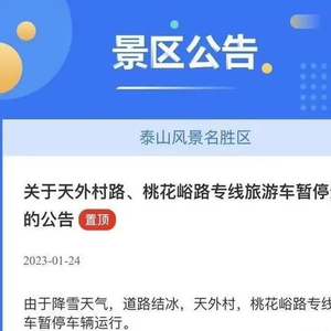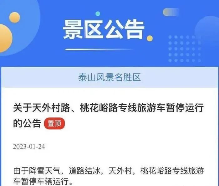 受本轮寒潮降雪影响,泰山山顶温度达到-22℃,部分道路积雪积冰。经除雪除冰,红门游览路(徒步)正常开放,天外村游览路(乘车)已经恢复通车,中天门索道正常运营中。目前,桃花峪游览路尚未通车、桃花源索道尚未恢复运营,已预约桃花峪路(乘车)进山的游客请勿前往。