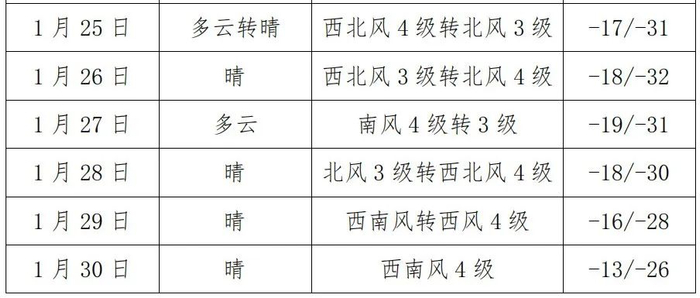 未来一周以晴好天气为主;未来三天齐齐哈尔市气温依然较低(市区最低气温维持在-30℃以下),28日开始气温逐渐回升,30日气温回升明显,市区最高气温可达-13~-11℃,夜间最低气温-21~-19℃;平均风力 3~4级。