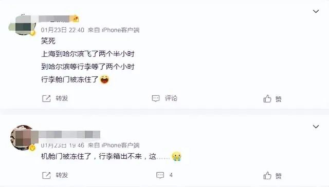 据@青蜂侠Bee,1月23日,多个网友发文称乘飞机抵达哈尔滨时,舱门被冻住了行李拿不出来。