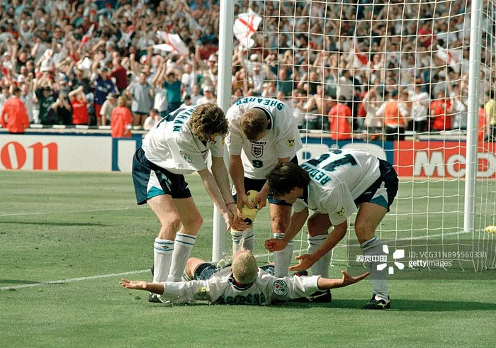 进球后的加斯科因“大”字形躺在地上,队友用水呲他