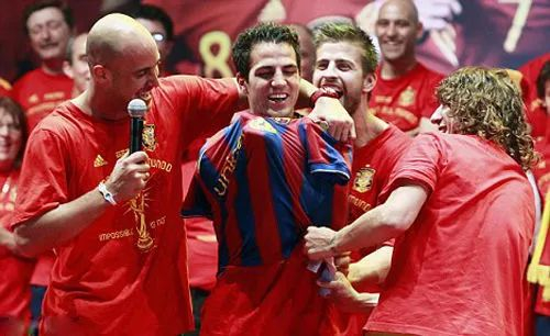 2010年,西班牙赢得世界杯冠军,在夺冠游行的彩车上,为阿森纳现任队长法布雷加斯披上了一件巴萨球衣