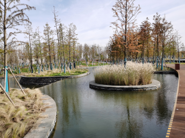 同时,公园内的水系及水景设置了独立的补水及排水循环装置,并通过局部挖填,在场地内形成一系列高低起伏的小山丘,打造特色的跌水台地,配合水杉种植,营造出一个自然幽林山涧的独特景观。