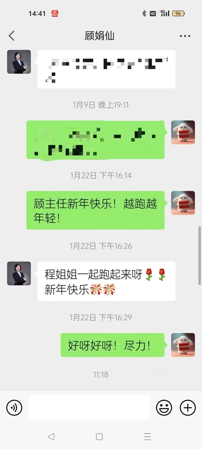 发祝福时,程小唱有些矛盾:“我觉得这两个月医生都太辛苦了,想问候下,但又害怕耽误她休息。”程小唱特地挑了顾医生热爱的跑马拉松,编进了祝福语里。没想到不到10分钟,她就收到了顾医生的回复:“程姐姐一起跑起来呀,新年快乐!”