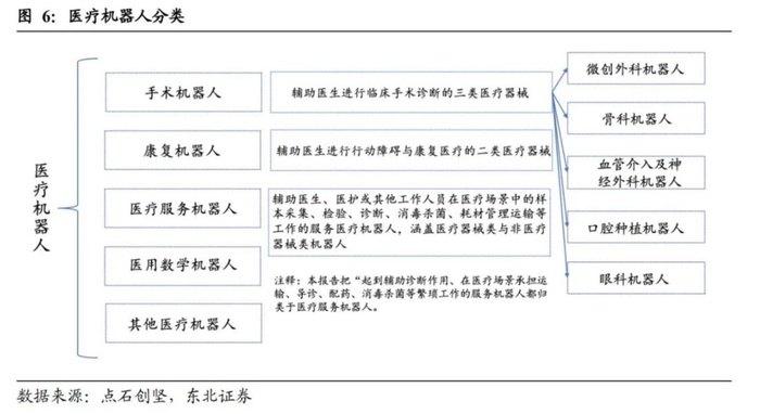按照病种与科室分,医疗机器人分手术机器人、辅助及服务机器人以及康复机器人。其中手术机器人占整体60%左右,包括微创外科机器人、骨科机器人、血管介入及神经外科机器人、口腔种植机器人和眼科机器人,其中骨科机器人占据机器人中大部分。