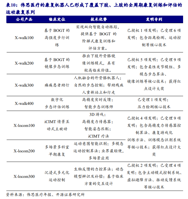 天智航-U的骨科手术定位机器人产品是首家获得CFDA核发的第三类医疗器械注册证的“骨科机器人导航定位系统”;埃斯顿旗下埃斯顿(南京)医疗科技主要从事医用机器人和养老照护机器人的开发及生产;伟思医疗的康复机器人产品Xwalk200/300系列已获批上市,近日上肢运动康复训练系统产品也获得医械注册证。