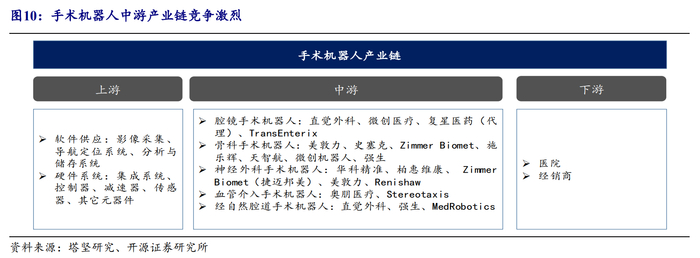 手术机器人行业包含全产业链,国内手术机器人相关企业集中于中游制造环节。多学科融合的手术机器人每套系统涉及超过35000个零件和2700余项专利,行业形成了以上游零部件及软件的供应商,中游各类手术机器人的生产制造商,下游以医院为主的共生产业链。