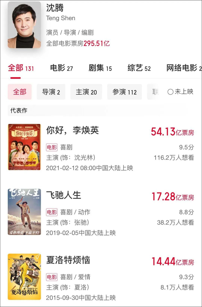 和吴京不同,沈腾的票房成绩较为分散。除了《你好,李焕英》票房超过了50亿,其他的作品如《独行月球》、《疯狂的外星人》、《飞驰人生》、《西虹市首富》、《羞羞的铁拳》、《夏洛特烦恼》等均在10亿到30亿级别。