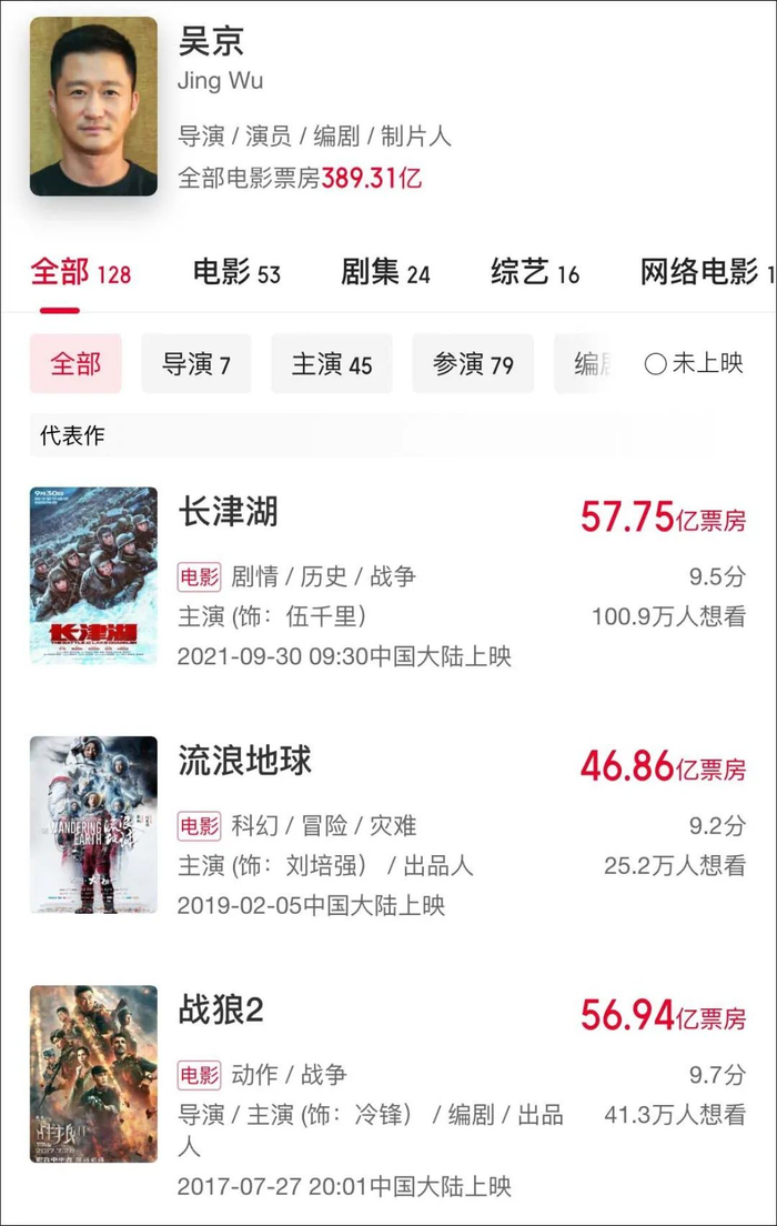 梳理吴京的电影作品可以发现,吴京在票房上的成绩主要来自近十年的电影作品,尤其是2017年票房逾56亿的《战狼2》之后,吴京的《流浪地球》获得46.86亿票房、两部《长津湖》分别获得57.75亿和40.67亿票房,成为其300亿票房的基石。