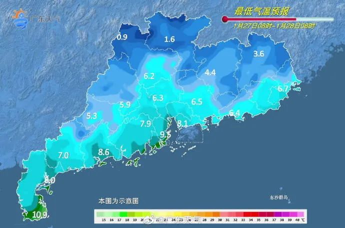 27日(初六),粤西和珠三角西部市县零星小雨和(轻)雾转多云,其余市县阴天局部零星小雨转多云到晴。最低气温:粤北市县5℃~8℃,南部市县14℃~16℃,其余市县9℃~13℃。28-29日(初七至初八),全省大部分市县晴到多云。最低气温:粤北市县1℃~3℃(高海拔山区零下2℃左右),中部市县4℃~8℃,南部市县9℃~13℃。
