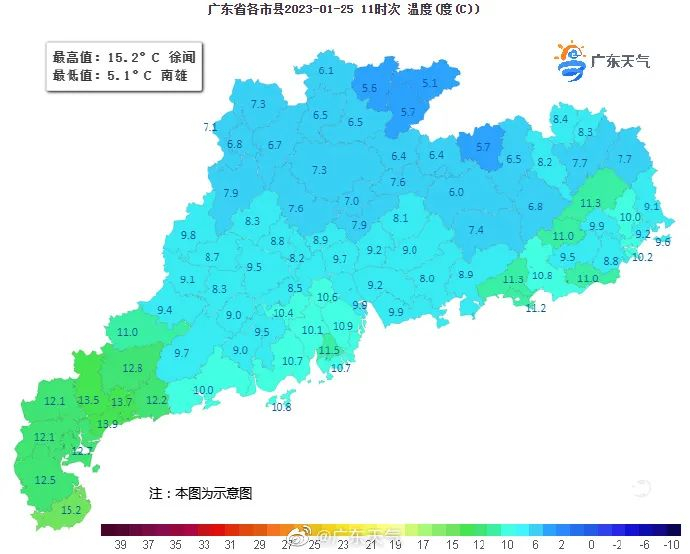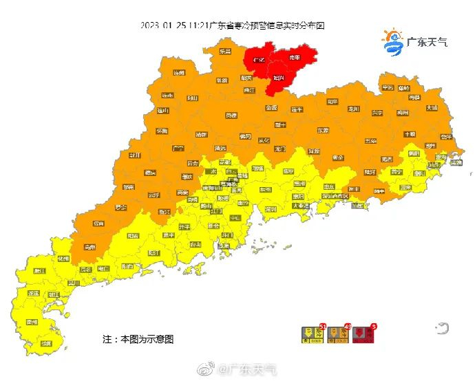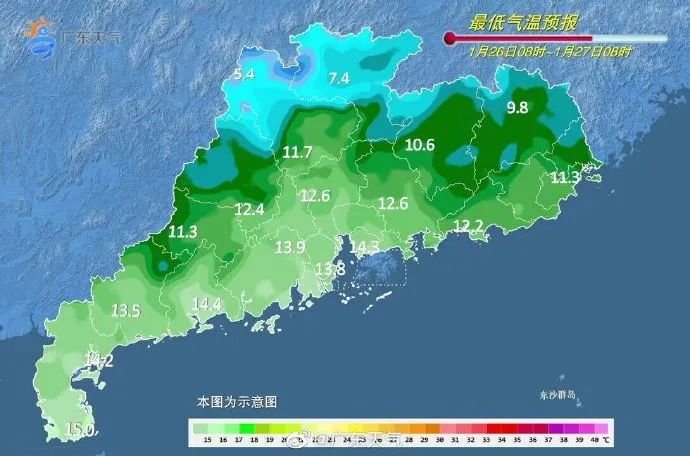 据@广东天气 预计,1月26-27日,广东省大部云量增多,气温回升,西部市县有零星小雨和(轻)雾。1月28-29日,受新一股冷空气影响,全省大部分市县晴到多云,日平均气温下降2℃~4℃,粤北和珠三角北部市县有5℃以下低温,局部有霜冻(冰)。
