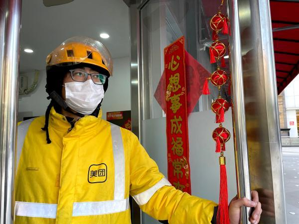 大年初四,虽然晴空万里,但上海市区的气温依旧徘徊在冰点。早上10时不到,美团专送的配送员杨权又已经骑车出门,开始接单前,他来到长宁路上兆峰广场门口的“暖新巣”服务驿站,给自己倒了杯热水暖暖身子。简单的休整后,戴上头盔,骑手小杨就开始送货了。