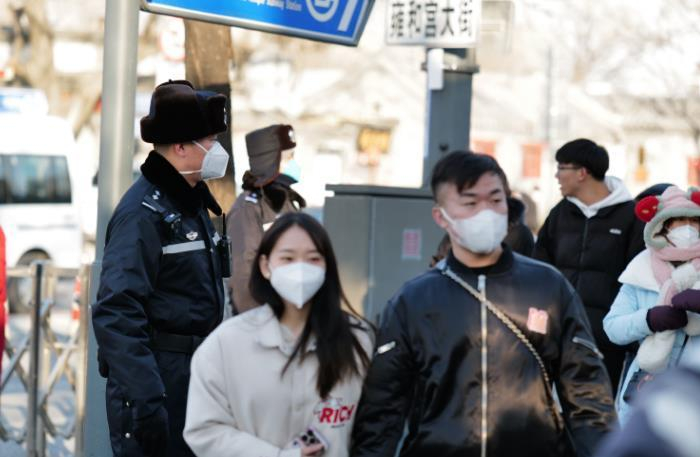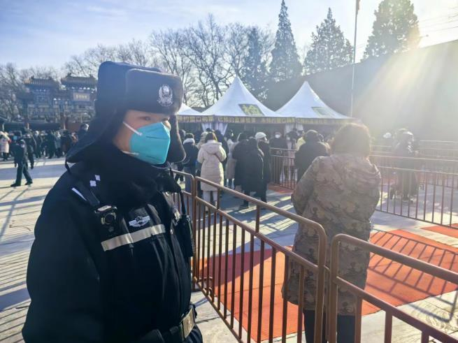 “注意脚下,台阶边缘滑。”“点完香的,大伙儿注意安全啊,香头朝上,别烫着其他人。”1月25日早上9点,气温还保持在-10℃,在雍和宫执勤的东城公安分局民警们又开始了忙碌的一天。