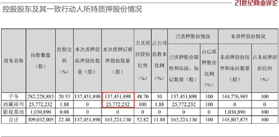 他旗下的西藏祥川公司,质押2577万股;于冬本人也质押1.37亿股,占其所持公司股份的近五成。