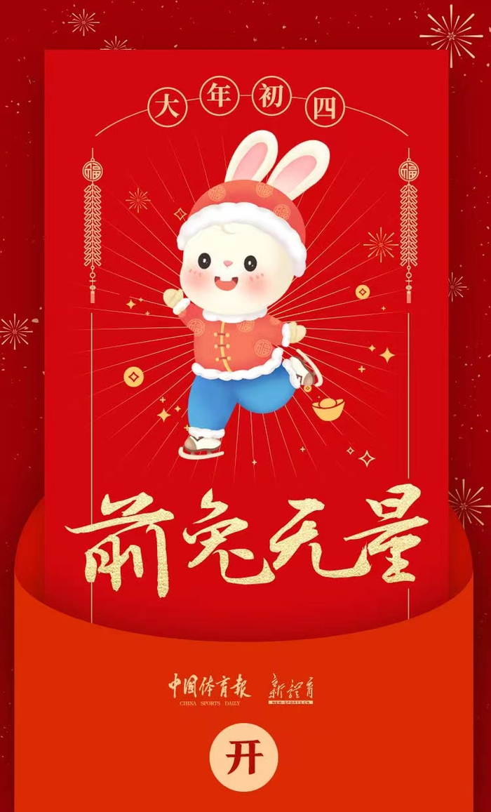 大年初四丨前“兔”无量 中国体育报 2023.01.2609:15 关注 转自:新体育网 金虎辞旧岁,玉兔迎新春。中国体育报·新体育网为大家送上拜年红包~大年初四,祝大家工作顺利,学习进步,前“兔”无量!