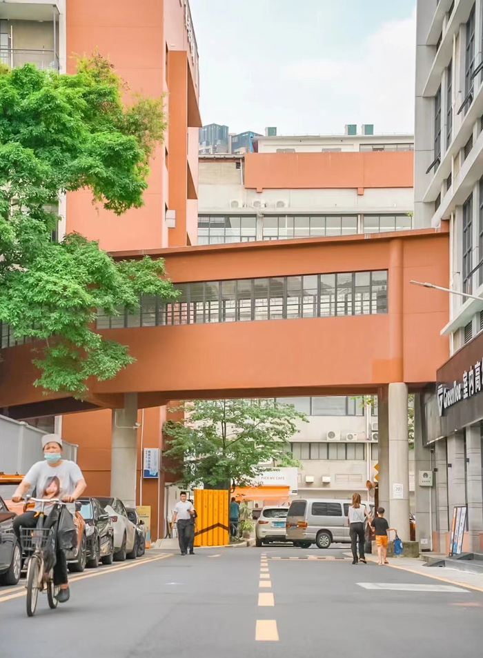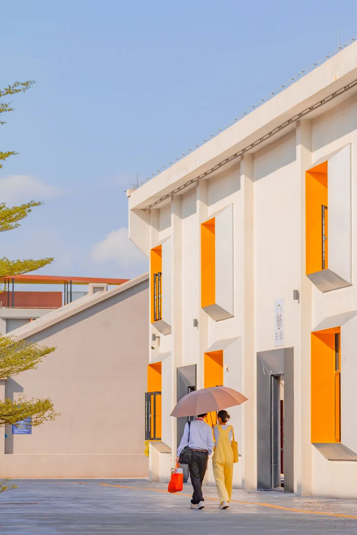 橙白相间的外墙,楼梯、走廊,构成一座浪漫的“日落色”创意园,如同夕阳洒落其中。