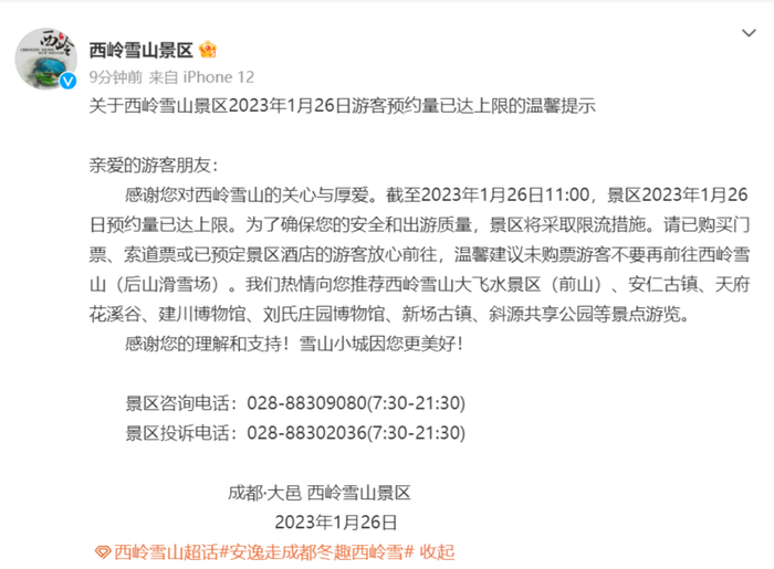 据西岭雪山景区,截至2023年1月26日11:00,景区2023年1月26日预约量已达上限。为了确保您的安全和出游质量,景区将采取限流措施。请已购买门票、索道票或已预定景区酒店的游客放心前往,温馨建议未购票游客不要再前往西岭雪山(后山滑雪场)。我们热情向您推荐西岭雪山大飞水景区(前山)、安仁古镇、天府花溪谷、建川博物馆、刘氏庄园博物馆、新场古镇、斜源共享公园等景点游览。