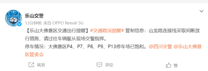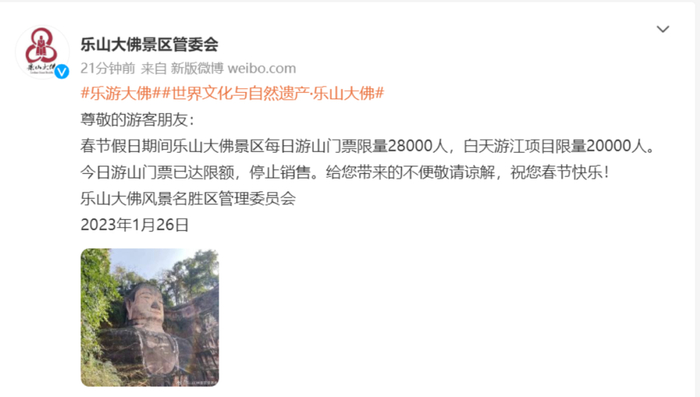 此外,1月26日,乐山交通发布乐山大佛景区交通出行提醒。
