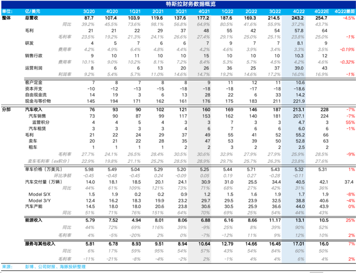 1.1 单价下滑拖累营收。2022年四季度特斯拉营收243亿美元,同比增37%;收入端看似低于彭博一致预期的255亿,但主要是因为市场之前高估了1.5多万辆的汽车销量,实际单车价格5.32万美元与市场预期基本一致,而汽车销量出来之后,汽车收入体量已基本确认,且股价已经及时反映了销量疲软以及后续降价对毛利率的打压。