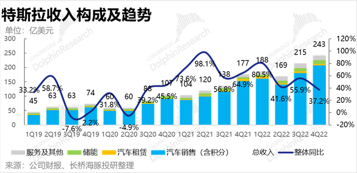 2. 能源和服务越来越好:能源因为储能业务的上量,增速和毛利率都在大幅上窜;而服务业务因为特斯拉路上存量车越来越多,修车、保养、加电等服务都在快速增长,二手车业务虽然价格高位跌落,但四季度还算有少许支撑,因此服务业务从收入到毛利率表现也都不错。