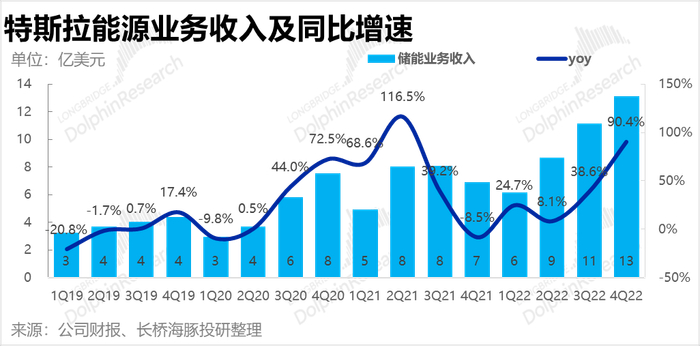 3.1 能源爆量:特斯拉储能和光伏业务包括向to C的住宅和to B小型商业及大型商业和公用事业级客户出售光伏系统和储能系统。2022年四季度实现营收13亿美元,进入夏季本来是安装的相对旺季,同比增长90%,而且在收入快速增长、安装供不应求的情况下,毛利率已经快速拉到了12%。