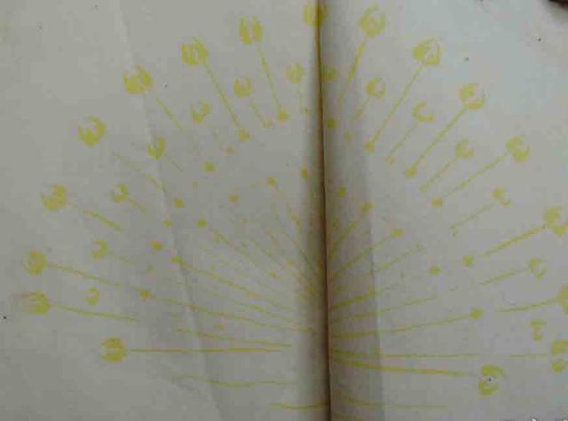 这本书的封面题字不是什么大人物,正是沈岳萌。封面内扉页图画则是诗人闻一多的一幅画,是一幅孔雀开屏图,设计成为对开的形式。