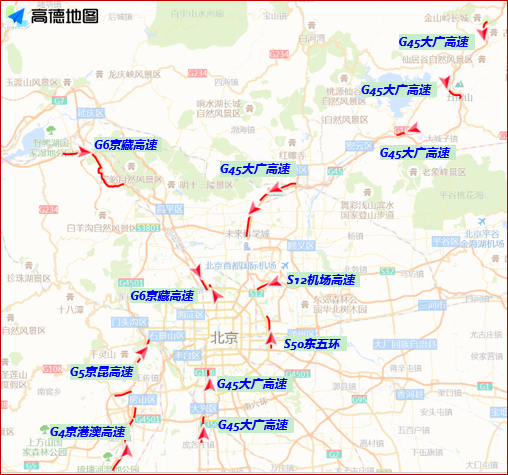 北京警方预计,26日、27日,市区路网通行压力将有所增加,京藏、京承、大广、京平、京哈 等各条高速的出京方向将在上午时段出现车流高峰;下午至晚间进京方向出现车流高峰, 与环路交叉的桥区节点和部分路段将出现车流集中的情况。