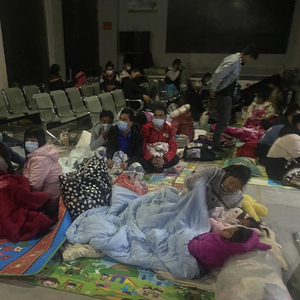 1月12日晚,不少缅籍人员办完相关手续后,直接在服务大厅领了铺盖,席地而睡,等天亮回家。澎湃新闻记者陈灿杰 图