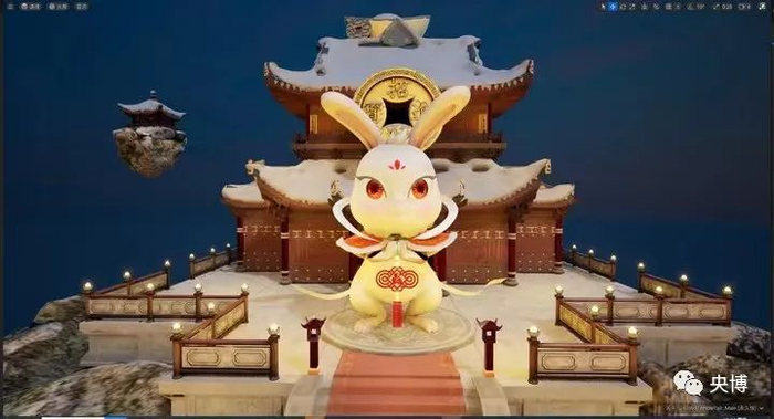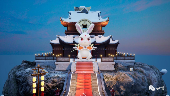 “央博新春云庙会”的东南角,财神庙前玉兔脚踏聚宝盆,手中不时抛出金元宝,象征着为百姓增添福禄、祝福百姓财源广进。