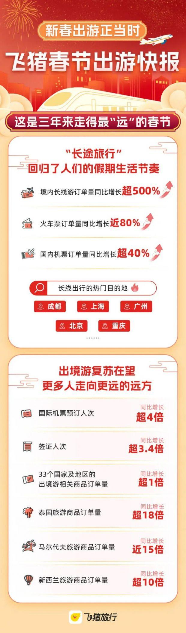 飞猪数据显示,今年春节境内长线游订单量同比增长超500%。交通出行的数据也反映了这一变化:国内机票订单量同比增长超40%,火车票订单量同比增长近80%。成都、上海、广州、北京、重庆都是热门目的地。