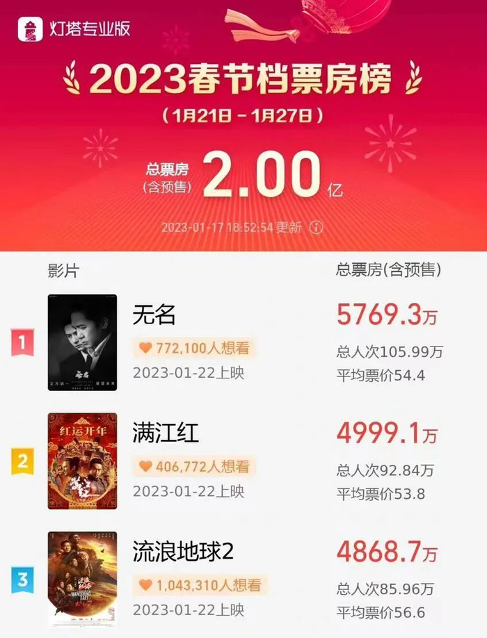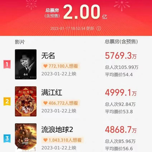 从预售期开始,《无名》的预售票房多次领跑*,比《流浪地球2》和《满江红》还抢手,成了这届春节档最强势的一匹黑马。