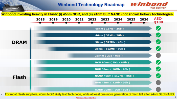 华邦电子认为,对于NOR Flash而言,45nm很可能是最后一个技术节点了,与之相比,SLC NAND Flash还有制程微缩空间,在24nm之后,至少还可以进一步微缩一代制程。