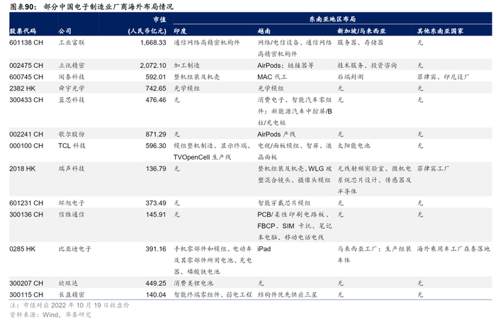 华泰证券分析师沈晓峰2022年10月20日发布的研报指出,中国果链企业中,工业富联、立讯精密、闻泰科技、蓝思科技、歌尔股份、TCL科技、环旭电子和长盈精密等A股上市公司在越南设厂,工业富联、立讯精密、闻泰科技、TCL科技、欣旺达和长盈精密等A股上市公司在印度设厂,此外,新加坡、马来西亚、菲律宾、印尼和泰国部分公司亦有所布局。